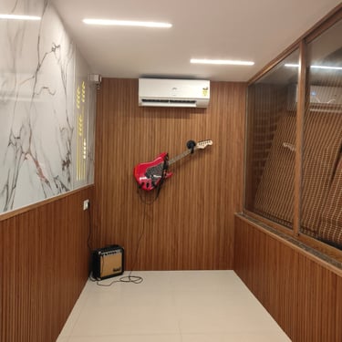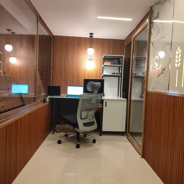 An open space transformed into a contemporary designer office through thoughtful planning and detailing. The design balances openness with functionality, creating defined work zones without compromising flow. Every element is curated to support creativity and productivity.